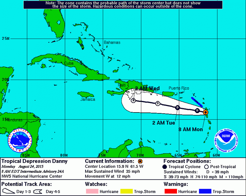 Dépression tropicale DANNY – Prévisions Lundi 24 Aout 2015 8h00