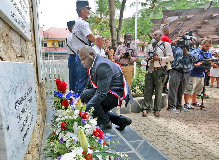 La présidente de la Collectivité, Aline Hanson, la préfète Anne Laubies, le député Daniel Gibbs, le sénateur Guillaume Arnell ont effectué un dépôt de gerbe, précédés par le président de l’association des anciens combattants.
