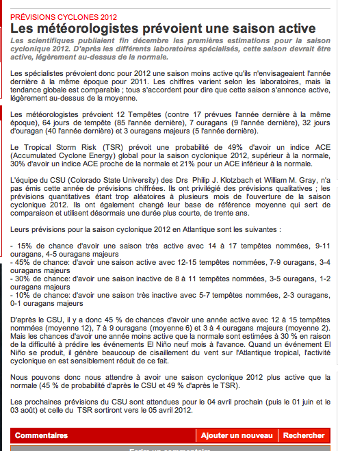 Cela serait sans doute passé inaperçu si le webmaster de chasseurs de cyclones n’avait pas feuilleté le numéro du 3 Janvier 2012. Petite surprise en lisant l’article du dit journal qui publie les prévisions cycloniques pour la saison 2012 ! Nous voilà en présence de la copie conforme de l’article du 7 décembre sur le portail chasseurs. Nous précisons qu’il est impossible au St martin Week d’avoir pu prendre les infos ailleurs, en effet, une partie du texte est une traduction de la version en anglais du référent TSR et CRU des données météo. Cette traduction est donc présente nulle part ailleurs (ou repris ICI sur sxminfo.fr en tant que co-éditeur) .