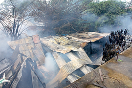 The Fire Brigade responded with two trucks. Getting access to the fire was not straight forward, as firemen had to thread their hoses through narrow alleys to reach the shacks located in a very confined space with other houses in close proximity to the fire.