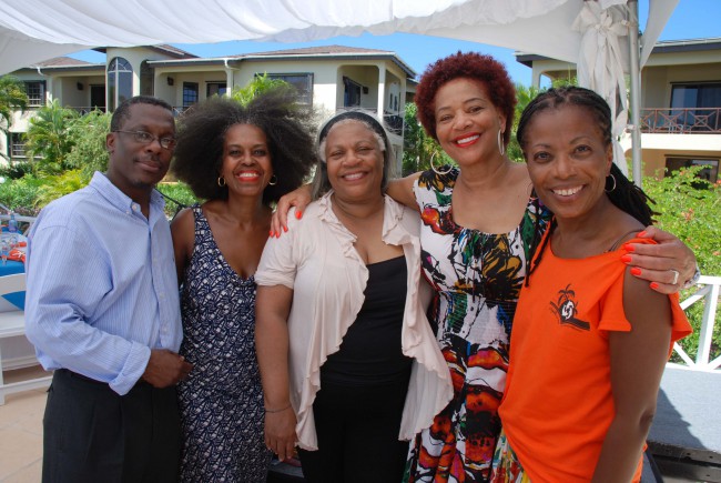 L-R: At Paradise Cove for Anguilla Lit Fest, May 24-28, 2012, Lasana M. Sekou, author, projects director at HNP, Malaika Adero, VP and senior editor at Atria Books/Simon and Schuster, Marva Allen of Hue-Man Bookstore in Harlem, Terry McMillan, award-winning author, Stephanie Stokes Oliver, author, editor of Unity Books. (Springer photo/HNP)