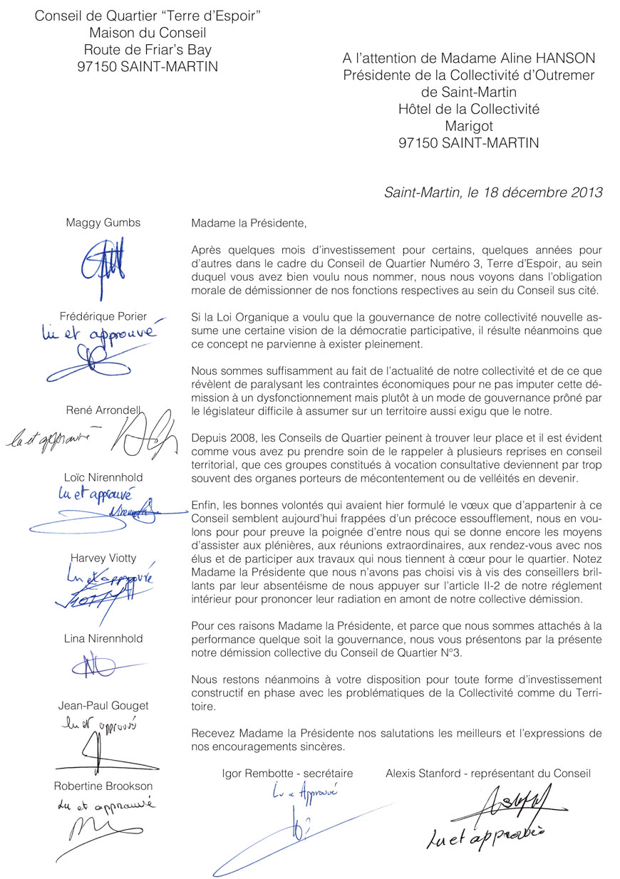 • en démissionner collectivement au profit de la création d’une association qui, elle, aurait pu donner une dimension aux projets de Monsieur Stanford. C’est en décembre 2013 ce qui avait décidé l’ensemble des membres composant ce noyau fonctionnel du conseil de quartier n°3 à prendre collectivement la décision de démissionner, non sans avoir au préalable acté la démission d’office des membres brillant par leur absentéisme. Courrier avait alors été rédigé en ce sens et transmis sur demande de Monsieur Stanford aux médias avant que de ne rappeler chacun d’entre eux pour en stopper la diffusion, aussi sur demande de Monsieur Stanford.
