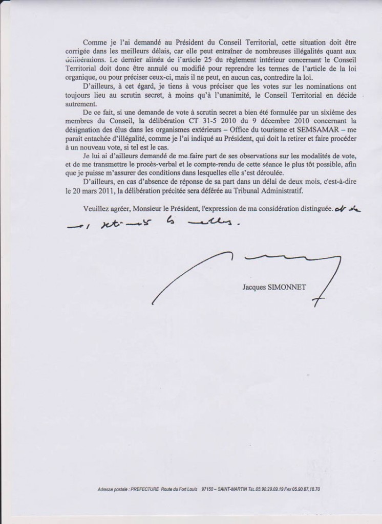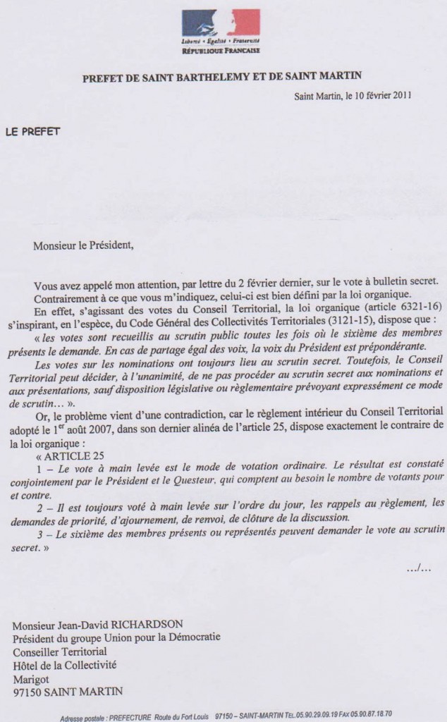 Marigot, le 19 mars 2011.- Dans une lettre au Président de la Collectivité et au Représentant du Groupe UD, qui avait demandé au préfet de statuer, ce dernier reconnaît l’illégalité du vote de la délibération CT-31-5 2010 prise lors du Conseil territorial du 9 décembre dernier.